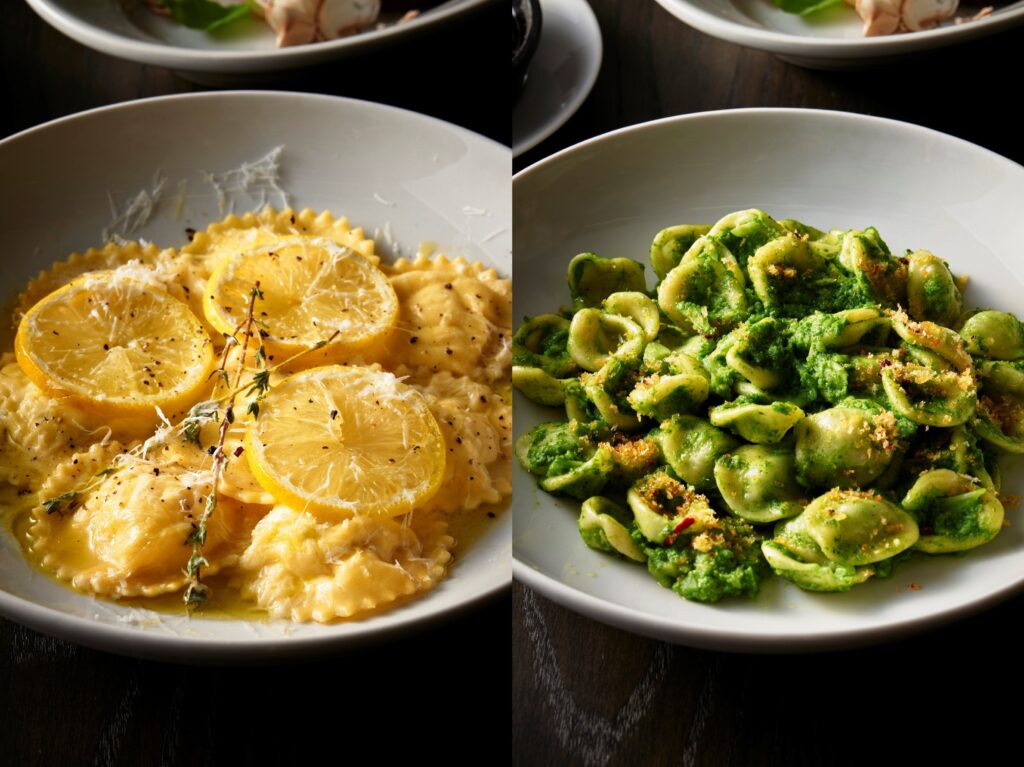 (左)自家製ラビオリを使った「瀬戸内レモンのバターソース」