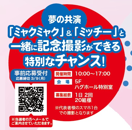 『夢の共演 「ミャクミャク」&「ミッチー」と一緒に記念撮影ができる 特別なチャンス!「記念撮影会」』
